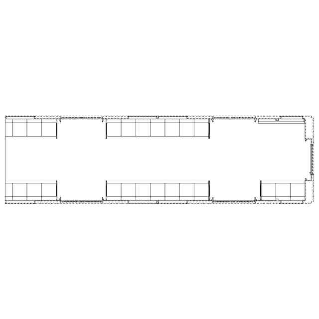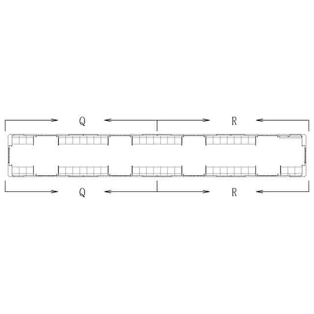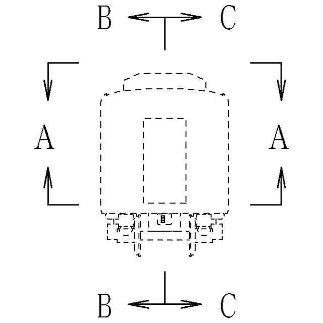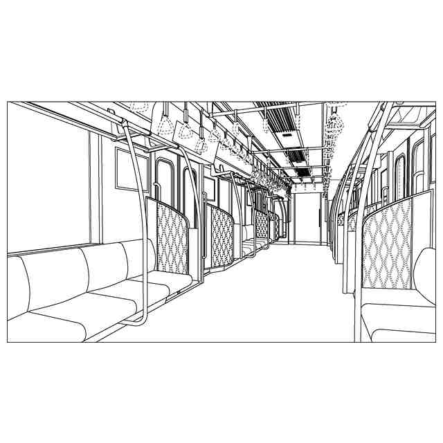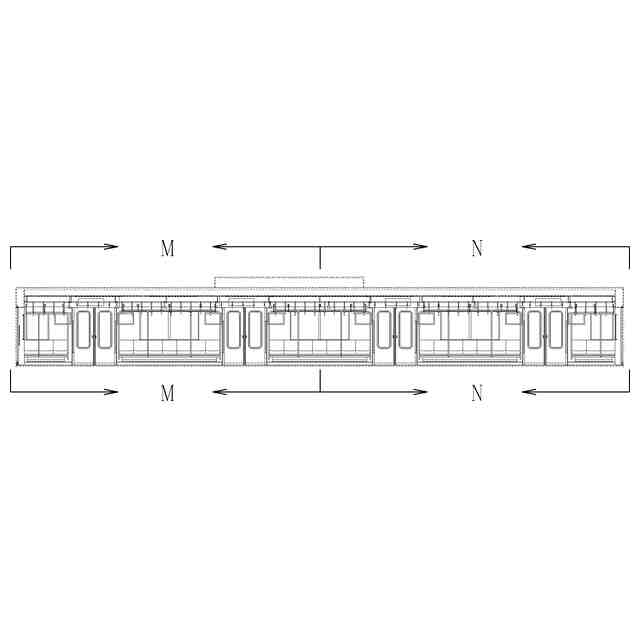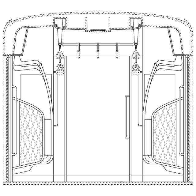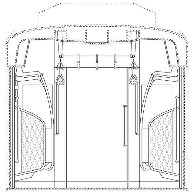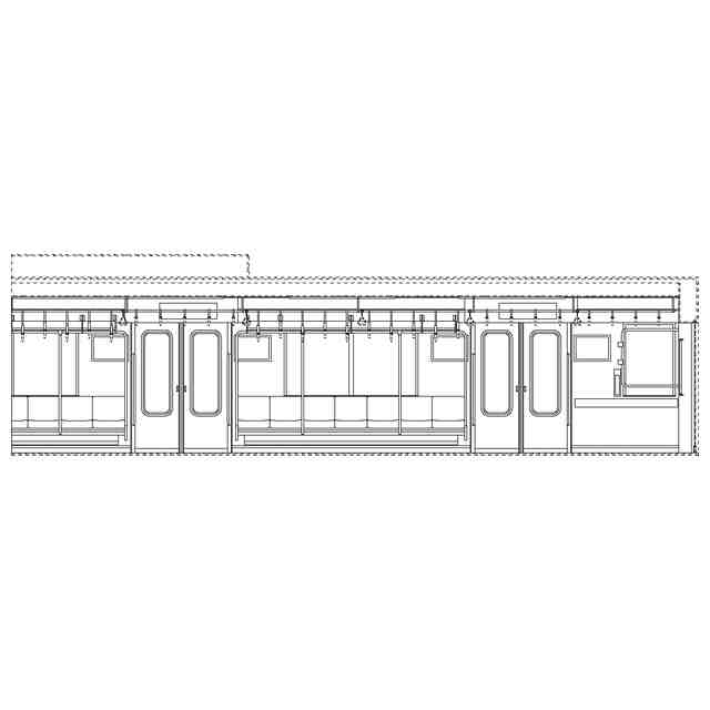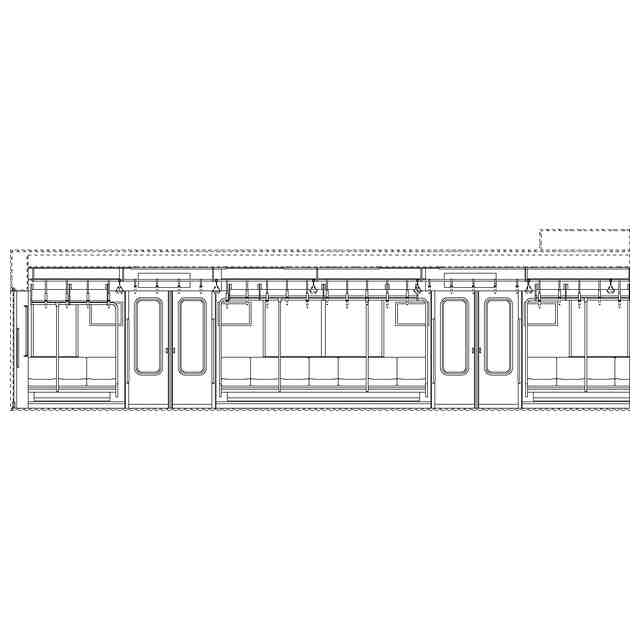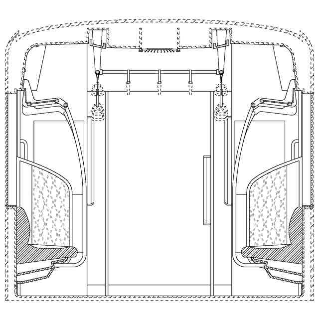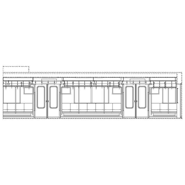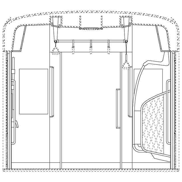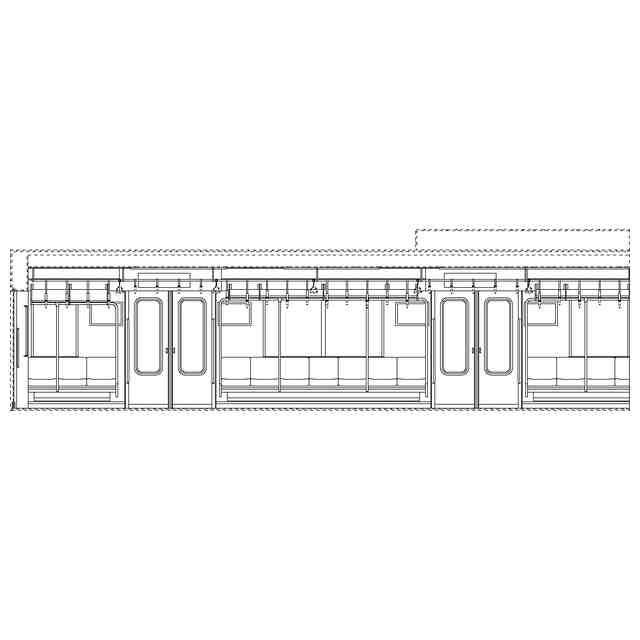 実線で示した部分が、部分意匠として意匠登録を受けようとする部分である。各断面図を含めて部分意匠として意匠登録を受けようとする部分を特定している。透明部を示す各参考断面図において、薄墨で示した各袖仕切りのパネル面、各窓、通路ドアの平板面部分は透明である。