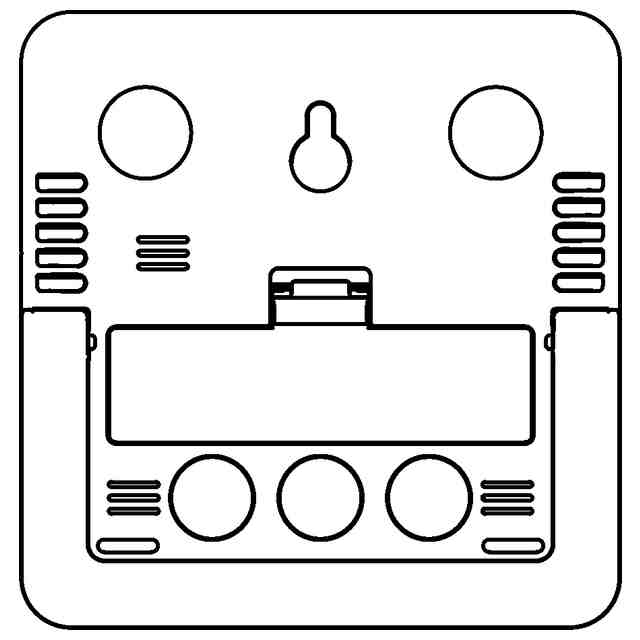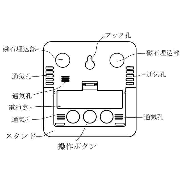 本物品は、温度及び湿度を計測し表示する温湿度計である。背面に表されているスタンドは、スタンドの上端部を軸に、左側面から見て背面側に約45度展開することができる。