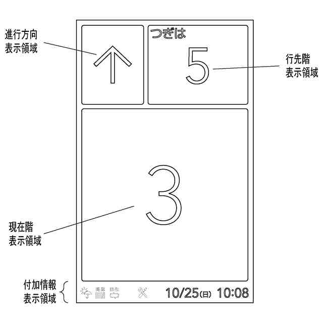 本画像は、エレベーターかご内に設置される表示器に表示され、現在階や行先階、進行方向を表示する画像であり、現在階と行先階は、進行に合わせて変化しながら表示されるようになっている。 付加情報表示領域には、状態表示や現在時刻等が表示される。