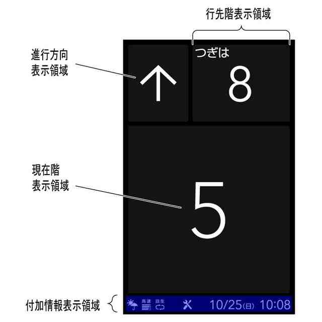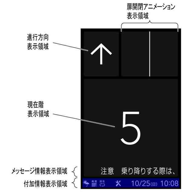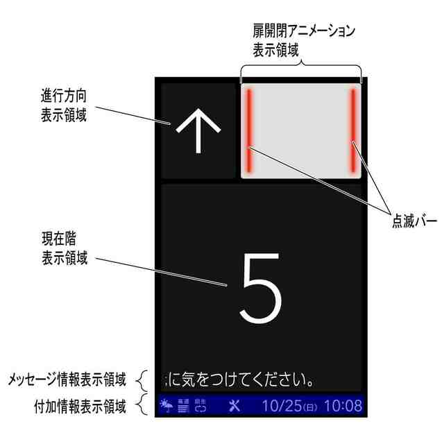 本画像は、エレベーターかご内に設置された表示器に表示される画像である。行先階(停止階)に到着すると、エレベーターの扉開動作に連動して、扉が開く状態をアニメーションで表示する(画像図1から画像図3)。扉が全開の状態(画像図3)の後、扉が閉じ始める寸前に画像図4のように左右端部付近に点滅するバーも更に表示される。 その後、扉閉動作に連動して、扉が閉じる状態をアニメーションで表示し(画像図5から画像図7)、扉が閉じるとアニメーションを表示していた領域が行先階を表示する領域に切り替わる(画像図8)。 各部の名称を示す参考図1、2、3はそれぞれ画像図1、4、8に対応している。メッセージ表示領域には、状況に応じたメッセージが表示され、付加情報表示領域には、状態表示や現在時刻等が表示される。