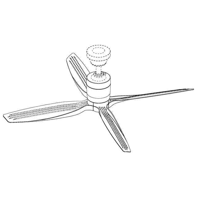 本物品は、使用状態を示す参考図に示すように、天井に取り付けて使用される天井扇風機である。