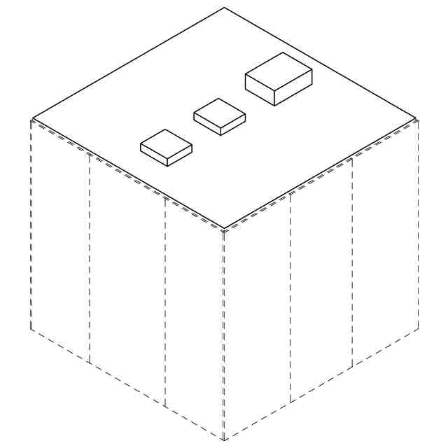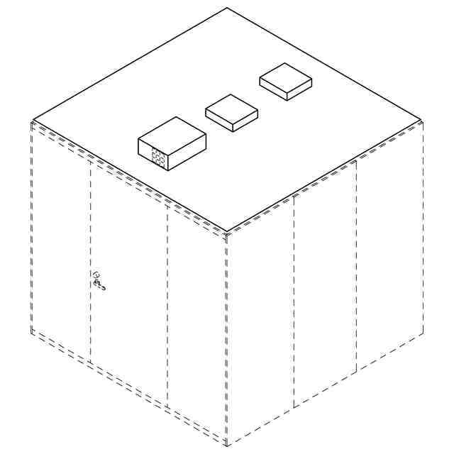 本物品は、正面側に扉を備え、ブース空間内に入り執務が可能なものである。天井上面の正面側にエアコン装置箱を備え、中央ならびに背面側に消火装置箱を備えたものである。