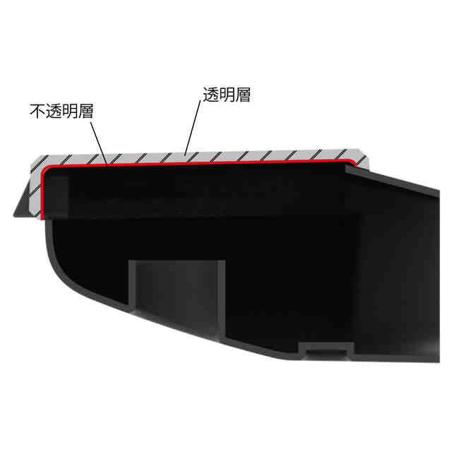 各図面はCGにより作成した図面であり、各図面の表面部全面に表された濃淡は、立体表面の形状を表す濃淡である。明調で表された部分が、部分意匠として意匠登録を受けようとする部分である。 「材質を表す参考斜視図」において水色で着色された部分及び「材質を表す参考A-A拡大断面図」において二重斜線で表される部分は透光性材質で構成されている。「材質を表す参考A-A拡大断面図」において赤色で表される部分は不透光であり、二層構造となっている。二層構造とすることにより、外観から見て、外部から入る光が透光層を通り、内部の不透光層で反射し、奥行きのある光を楽しむことができる。