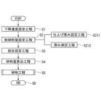 また、本研削方法は、該溝形成ステップの前に実施され、該被加工物における該基板の該第1面側を第1チャックテーブルの第1保持面によって保持する第1保持ステップ、および、該溝形成ステップの後であって該研削ステップの前に実施され、該被加工物における該基板の該第1面側を、第2チャックテーブルの第2保持面によって保持する第2保持ステップをさらに含んでいてもよく、該溝形成ステップは、該第1チャックテーブルの該第1保持面に保持されている該被加工物に対して実施されてもよいとともに、該研削ステップは、該第2チャックテーブルの該第2保持面に保持されている該被加工物に対して実施されてもよい。