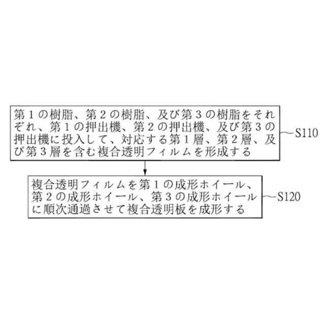 上記の技術的課題を解決するために、本発明が採用する一つの技術的手段は、複合透明板の製造方法を提供する。複合透明板の製造方法は、第1の樹脂、第2の樹脂、及び第3の樹脂をそれぞれ、第1の押出機、第2の押出機、及び第3の押出機に投入して、対応する第1層、第2層、及び第3層を含む複合透明フィルムを形成する、供給工程と、前記複合透明フィルムを第1の成形ホイール、第2の成形ホイール、第3の成形ホイールに順次通過させて複合透明板を成形する、成形工程と、を含み、前記第1の樹脂は、Tairilin 3824、Tairilin 3842、Tairilin 390A、Tairilin P115、Tairilin 663G及びSKYGREEN(登録商標) S2008からなる群から選択され、前記第2の樹脂は、Tairilin 3760及びTairilin 3842からなる群から選択され、前記第3の樹脂は、Tairilin 3760、Tairilin 3842、Tairilin 380R及びTairilin 384Rからなる群から選択され、前記第1の成形ホイールの温度と前記第2の成形ホイールの温度との差の絶対値は5℃以下であり、前記第3の成形ホイールの温度と前記第1の成形ホイールの温度又は前記第2の成形ホイールの温度との比(第3の成形ホイールの温度/第1の成形ホイール、もしくは第3の成形ホイールの温度/第2の成形ホイール)は1.8~3.5であり、前記複合透明板は、0.75%~4%のヘイズ値及び86%~91.5%の光透過率を有する。