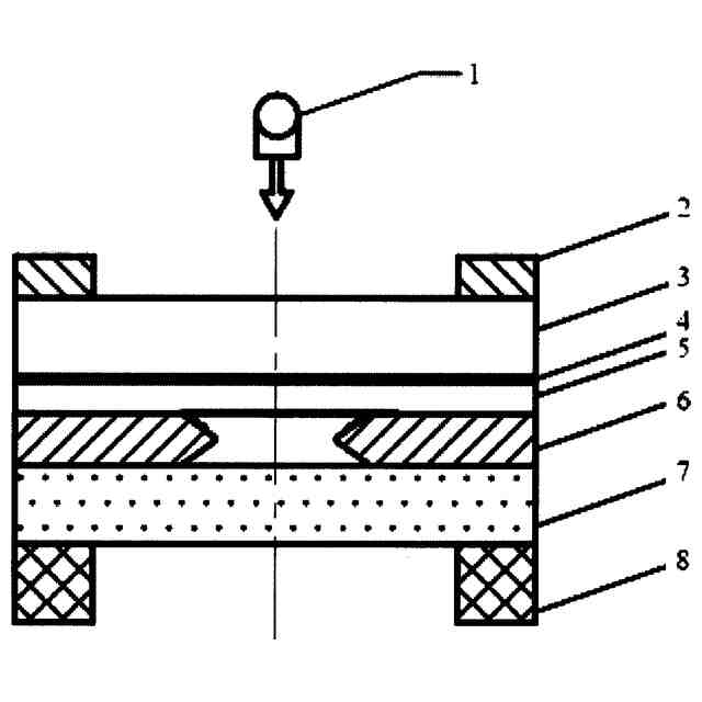 本発明の第2の側面は、前記方法を実現する装置であって、下からこの順で積層配置された底部型、砂時計状スルーホール付き下層板材、上層板材、吸収層及び拘束層を含み、ワーク挟持系で各層を挟み付けて作業台に固定し、