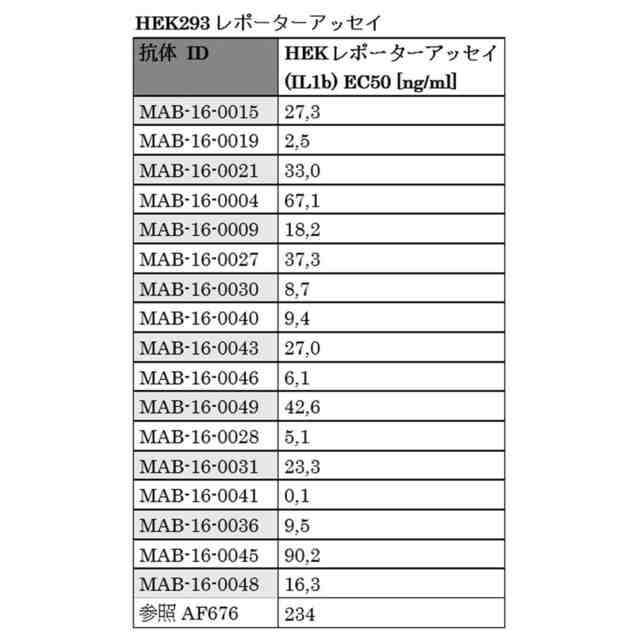 HEK293レポーターアッセイ HEK293T/17-FR細胞にpGL4.32[luc2P/NF-κB-RE/Hygro]ベクター(Promega)を安定的にトランスフェクトし、384ウェルPDL Costar細胞培養プレートに播種し、その後抗体とともに30分間インキュベートした。次に、細胞をIL-1βで5時間刺激し、その後製造業者のプロトコルにより、Steady-Glo Luciferase アッセイキット(Promega)を使用してNF-kB活性を測定した。