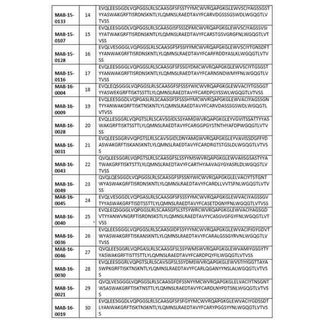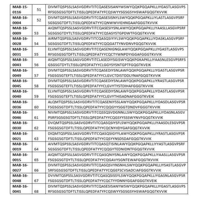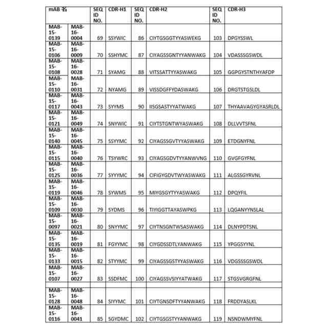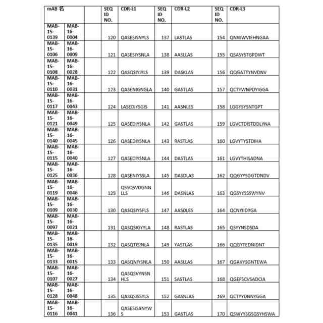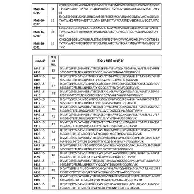 配列(一文字コードのアミノ酸) 可変領域(VR)の完全配列: 重鎖:VH完全:配列番号1~34並びに配列番号173及び176 軽鎖:VL完全:配列番号35~68並びに配列番号174及び177 相補性決定領域(CDR): 重鎖:CDRH1:配列番号69~85及び178CDRH2:配列番号86~102及び179CDRH3:配列番号103~119及び180 軽鎖:CDRL1:配列番号120~136及び181CDRL2:配列番号137~153及び182CDRL3:配列番号154~170及び175及び183 定常領域(CR): 軽鎖:CR-L:配列番号171重鎖:CR-H:配列番号172 次の図では、AF676は次のリンク:https//www.rndsystems.com/products/human-il-1-racp-il-1-r3-antibody_af676から購入した市販のポリクローナル抗体調整物である。