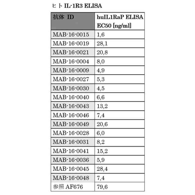 ヒトIL-1R3 ELISA 384-マイクロタイタープレートを、IL-1R3のヒト細胞外ドメインを表すヒトIL-1R3タンパク質でコーティングした(0.5mg/ml、少なくとも1時間)。集中的な洗浄ステップとそれに続くブロッキングステップの後、抗体を加え(ウェルあたり12,5μl)及び室温で1時間インキュベートした。非結合抗体は集中的に洗い流した。結合した抗体の量は、マイクロタイタープレートでペルオキシダーゼ標識抗ヒト検出抗体とインキュベートすることにより同定した(室温で1時間)。TMBを添加によりペルオキシダーゼ反応を開始し、450nm/620nmで吸光度を測定した。