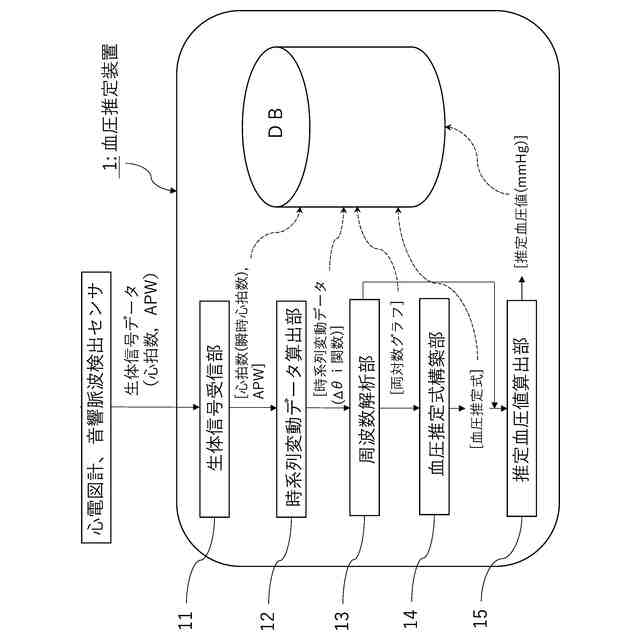 【解決手段】 本発明では、4次多項式の設定に当たって、両対数グラフの中から非周期成分と周期成分を区分する境界周波数を抽出し、その境界周波数を挟んだ低周波帯域又は高周波帯域に設定される4次多項式で示される近似曲線から上記の周波数勾配を求める。4次多項式で示される近似曲線の設定を、両対数グラフの表示中、非周期成分と周期成分の境界を挟んだ帯域のそれぞれに行うことで、周波数勾配を血管内の波動に適合する形で求めることができ、血圧値の推定精度を高めることができる。