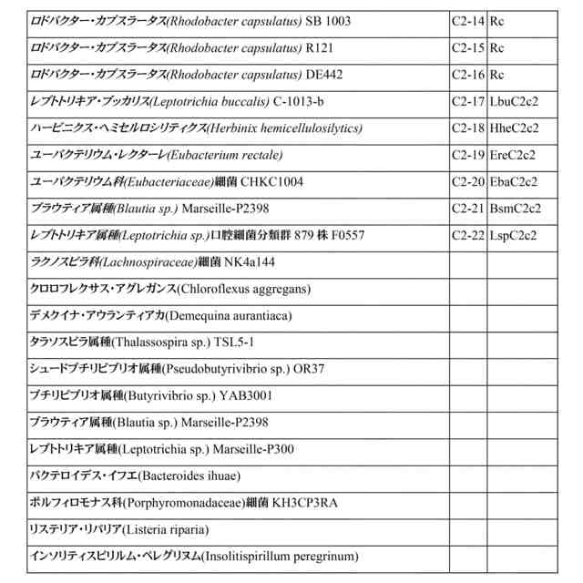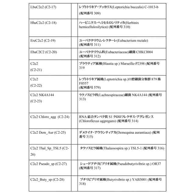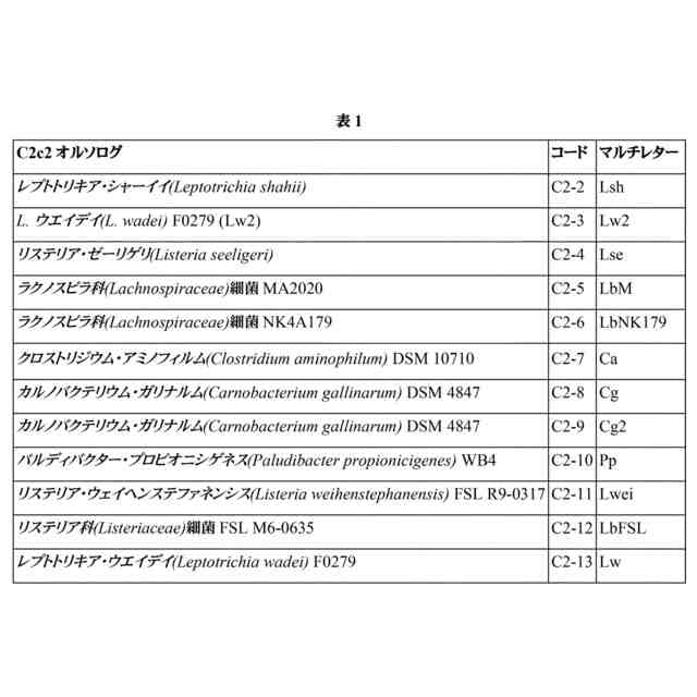 一例示的実施形態において、CRISPRシステムエフェクタータンパク質はRNAターゲティングエフェクタータンパク質である。例示的RNAターゲティングエフェクタータンパク質としては、Cas13b及びC2c2(現在はCas13aとして知られる)が挙げられる。用語「C2c2」は、本明細書では「Cas13a」と同義的に使用されることは理解されるであろう。別の例示的実施形態において、RNAターゲティングエフェクタータンパク質はC2c2である。他の実施形態において、C2c2エフェクタータンパク質は、レプトトリキア属(Leptotrichia)、リステリア属(Listeria)、コリネバクター属(Corynebacter)、ステレラ属(Sutterella)、レジオネラ属(Legionella)、トレポネーマ属(Treponema)、フィリファクター属(Filifactor)、ユーバクテリウム属(Eubacterium)、ストレプトコッカス属(Streptococcus)、ラクトバチルス属(Lactobacillus)、マイコプラズマ属(Mycoplasma)、バクテロイデス属(Bacteroides)、フラビイボラ属(Flaviivola)、フラボバクテリウム属(Flavobacterium)、スフェロヘータ属(Sphaerochaeta)、アゾスピリラム属(Azospirillum)、グルコンアセトバクター属(Gluconacetobacter)、ナイセリア属(Neisseria)、ロゼブリア属(Roseburia)、パルビバクラム属(Parvibaculum)、スタフィロコッカス属(Staphylococcus)、ニトラチフラクター属(Nitratifractor)、マイコプラズマ属(Mycoplasma)、カンピロバクター属(Campylobacter)、及びラクノスピラ属(Lachnospira)からなる群から選択される属の生物由来であり、又はC2c2エフェクタータンパク質は、レプトトリキア・シャーイイ(Leptotrichia shahii)、レプトトリキア・ウエイデイ(Leptotrichia wadei)、リステリア・ゼーリゲリ(Listeria seeligeri)、クロストリジウム・アミノフィルム(Clostridium aminophilum)、カルノバクテリウム・ガリナルム(Carnobacterium gallinarum)、パルディバクター・プロピオニシゲネス(Paludibacter propionicigenes)、リステリア・ウェイヘンステファネンシス(Listeria weihenstephanensis)からなる群から選択される生物であり、又はC2c2エフェクタータンパク質はL.ウエイデイ(L.wadei)F0279又はL.ウエイデイ(L.wadei)F0279(Lw2)C2c2エフェクタータンパク質である。別の実施形態において、1つ以上のガイドRNAは、標的RNA又はDNAにおける一塩基変異多型、転写物のスプライス変異体、又はフレームシフト突然変異を検出するように設計される。