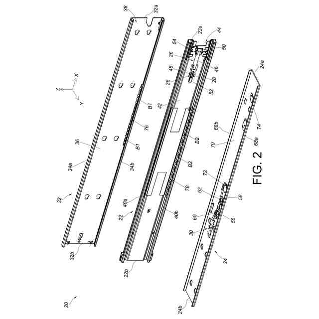図2は、本発明の実施形態に係る、第1のレール、第2のレール及び第3のレールを含むスライドレールアセンブリの分解図である。