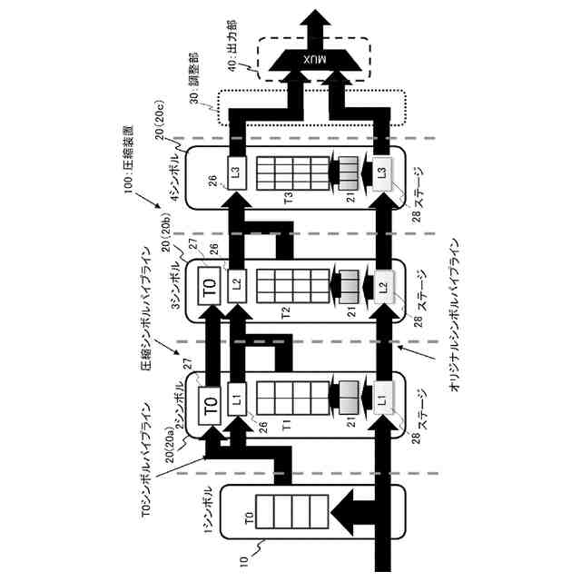 オリジナルシンボルが圧縮された圧縮シンボルが前記第1のパイブラインを流れるオリジナルシンボルと同期をとって次のステージにシフトする第2のパイプラインと、