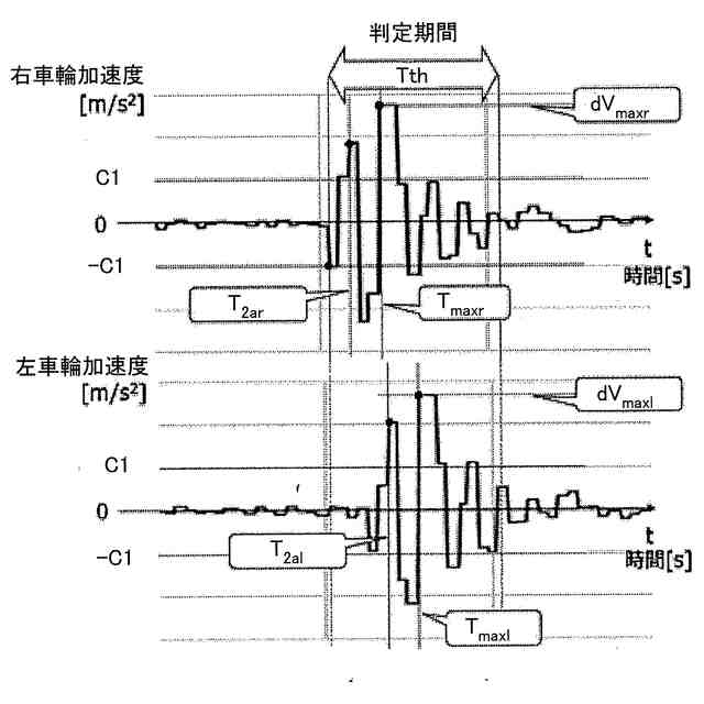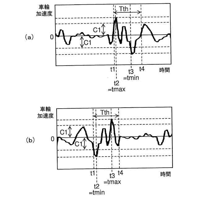 (a)は車輪が凸部を通過した際の車輪加速度のタイムチャートであり、(b)は車輪が凹部を通過した際の車輪加速度のタイムチャートである。