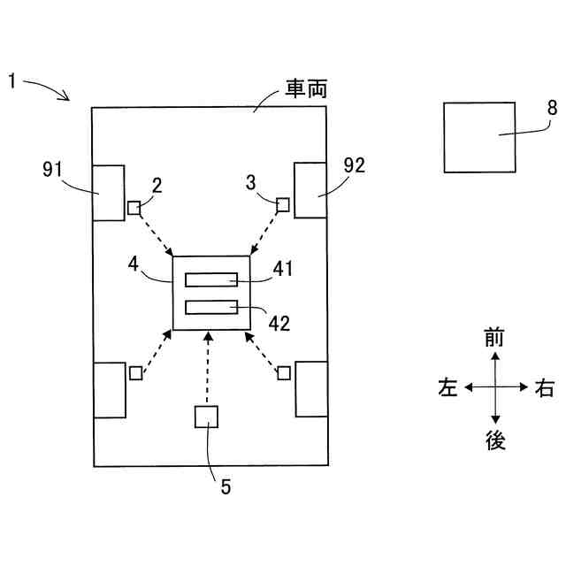 本実施形態の路面状態検出システム1は、図1に示すように、左車輪速度センサ(「車輪速度センサ」に相当する)2と、右車輪速度センサ(「車輪速度センサ」に相当する)3と、車載コンピュータ4と、位置検出装置5と、を備えている。左車輪速度センサ2は、左車輪91に対して設けられ、左車輪91の車輪速度を検出する。右車輪速度センサ3は、左車輪91と左右方向に対向して配置された右車輪92に対して設けられ、右車輪92の車輪速度を検出する。左車輪91と右車輪92とは、車両前後方向において同じ位置に配置されている。つまり、本実施形態のように、車両が左右の前輪と左右の後輪を持つ4輪車である場合、左車輪91が左前輪であれば右車輪92は右前輪であり、左車輪91が左後輪であれば右車輪92は右後輪である。本説明では、左車輪91が左前輪であり、右車輪92が右前輪である。