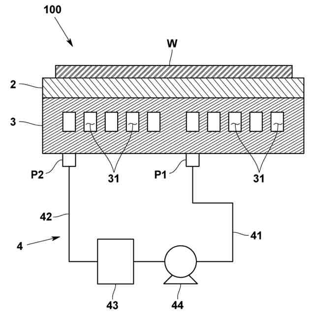 ここで、冷却プレートには、内部流路に冷媒を導入するための導入ポート及び冷媒を導出するための導出ポートが設けられており、導入ポート近傍は冷媒に優先的に冷却されるため低温領域となり、内部流路を流れるに連れて冷媒の温度が高くなるため、その冷媒が導出される導出ポート近傍は高温領域となる。つまり、冷却プレートには、温度勾配が生じてしまう。この温度勾配が大きくなってしまうと、吸着プレートに吸着されているウエハが熱応力によってひび割れしまい、また、吸着プレートが破損してしまう可能性がある。