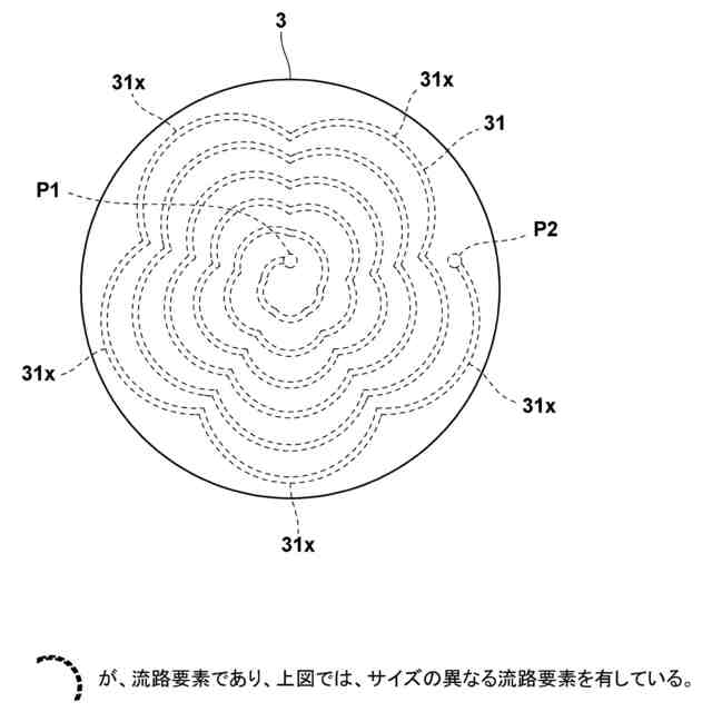 具体的な実施の態様としては、前記流路要素は、湾曲している流路部分、屈曲している流路部分、又は間に折れ曲がった流路部分を有していることが望ましい。