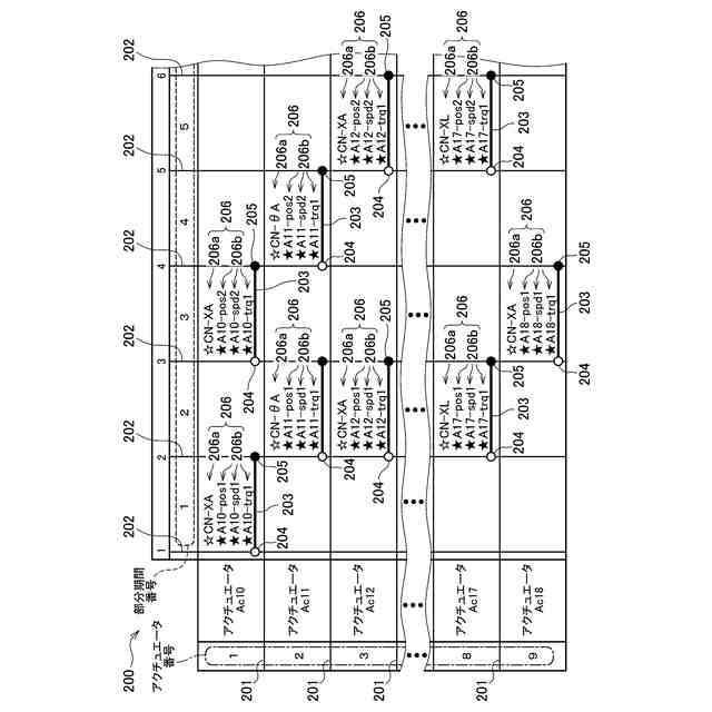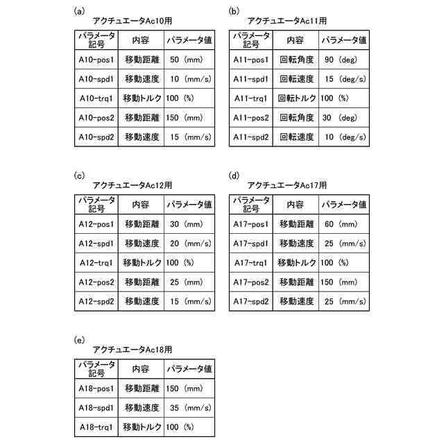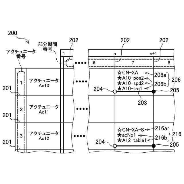 また、YOGOチャートのマス目の位置には、アクチュエータの基本動作を記載する。ここで、アクチュエータの基本動作とは、アクチュエータが所定の距離だけ前進あるいは後退する動作や、所定の角度だけ回転する動作のように、アクチュエータが備える最も基本的な動作である。自動製造機械のどのような複雑な動作も個々のアクチュエータの基本動作に分解することができるから、YOGOチャートのマス目の位置に基本動作を記載することによって自動製造機械の動作を記述することができる。そして、このようなYOGOチャートを作成しておけば、先頭の部分期間から順番に、その部分期間に割り当てられた内容を読み出してアクチュエータに基本動作を実行させる動作を繰り返していくことで、自動製造機械に所望の動作をさせることができる。