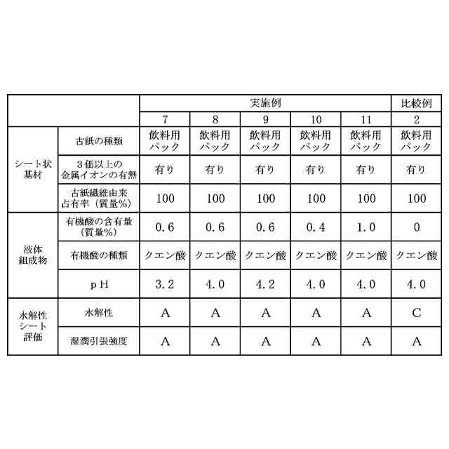 本発明者らは、前記課題を解決するべく種々検討した結果、繊維としてバージンパルプを用い且つ水溶性バインダを含有する従来公知の水解性シートにおいて、単に、バージンパルプに代えて古紙由来繊維を用いただけでは、水解性が著しく低下する場合があることを知見した。また本発明者らは、斯かる水解性の低下が、古紙由来繊維に含まれる3価以上の金属イオンと前記水溶性バインダとによる不溶塩の形成によるものであることも知見した。そして本発明者らは、これらの知見に基づき更に検討した結果、シートの構成繊維として古紙由来繊維を用いるとともに、該シートに保持させる液体組成物に有機酸を含有させることで、前記不溶塩の形成が抑制され、前記課題を解決した水解性シートが得られることを知見した。