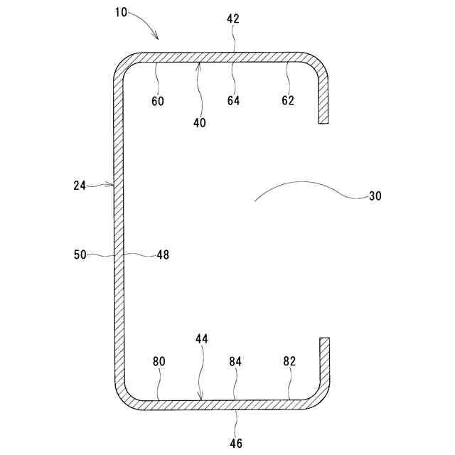 フランジ20,22のうち内側空間30に対向する部分に限界向上区域60,62,80,82が設けられることは、その限界向上区域60,62,80,82が設けられる箇所の厚さが厚い場合と同様に、弾性限界の低下を抑えることにつながる。このようにして弾性限界の低下が抑えられることは、支え得る荷重の低下を抑えつつフランジ20,22の厚さを薄くし得ることを意味する。厚さを薄くし得ることは、支え得る荷重の低下を抑えつつさらなる軽量化を図り得ることを意味する。これにより、フランジ20,22のうち内側空間30に対向する部分に限界向上区域60,62,80,82が設けられると、支え得る荷重の低下を抑えつつさらなる軽量化を図り得ることとなる。