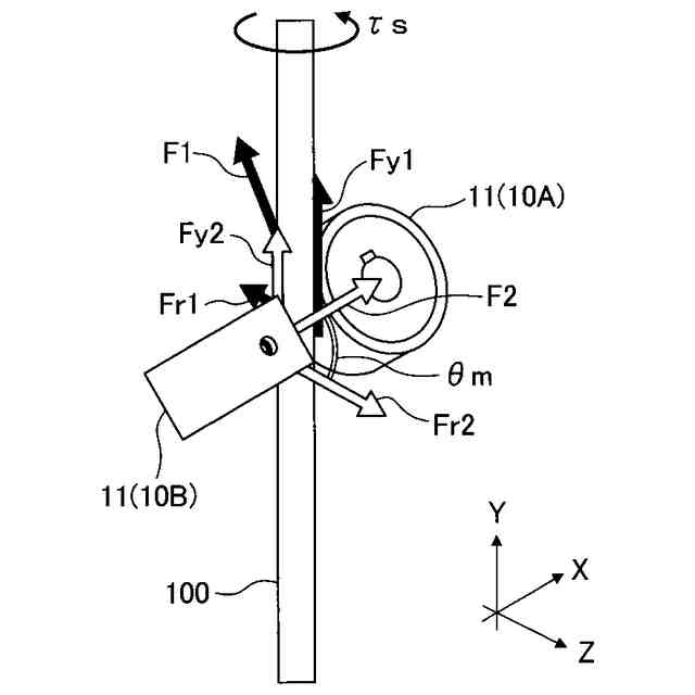 本態様も、所定の細長い部材の軸線回りにおける姿勢制御対象の回転位置(姿勢)をCMGにより制御する場合における当該CMGの飽和回避制御に適用されるものである。ただし、本態様では、トルク発生装置として、前記細長い部材の周面に当接して当該細長い部材の軸線回りに姿勢制御対象を回転駆動させる駆動回転体と、当該細長い部材の軸線に対する駆動回転体の回転軸の角度を変更する軸角度変更部とを備えるものを用いる。そして、このトルク発生装置を用い、軸角度変更部に駆動回転体の回転軸の角度を変更させる制御を行うことで、細長い部材の軸線回りに所望の飽和回避トルクを発生させ続けることができる。これによれば、CMGの制御飽和状態を回避するための飽和回避トルクを発生させ続けることが可能となるので、前記細長い部材の軸線回りにおける姿勢制御対象の回転位置(姿勢)の制御を安定して持続することができる。