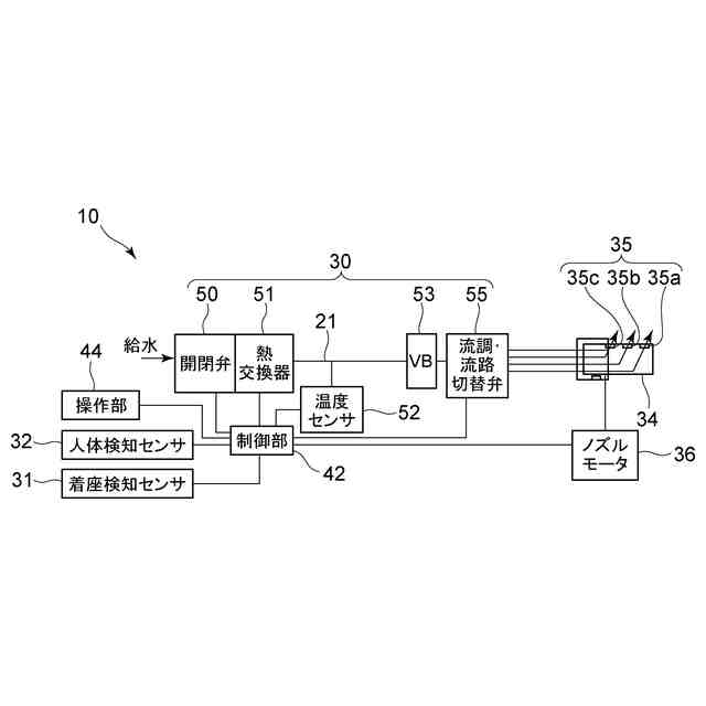 前記制御部は、前記熱交換器を第1出力で駆動して前記熱交換器によって温められた水を、使用者の局部に向けてノズルに吐出させる温水洗浄制御を実施可能であり、