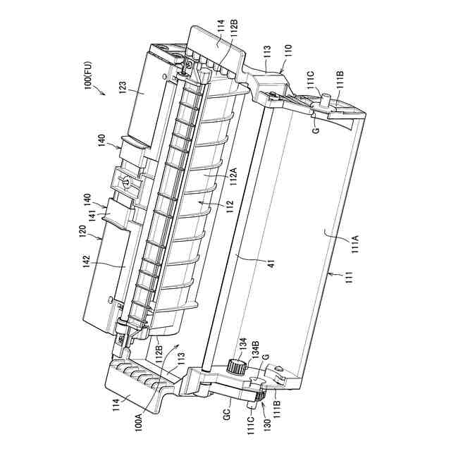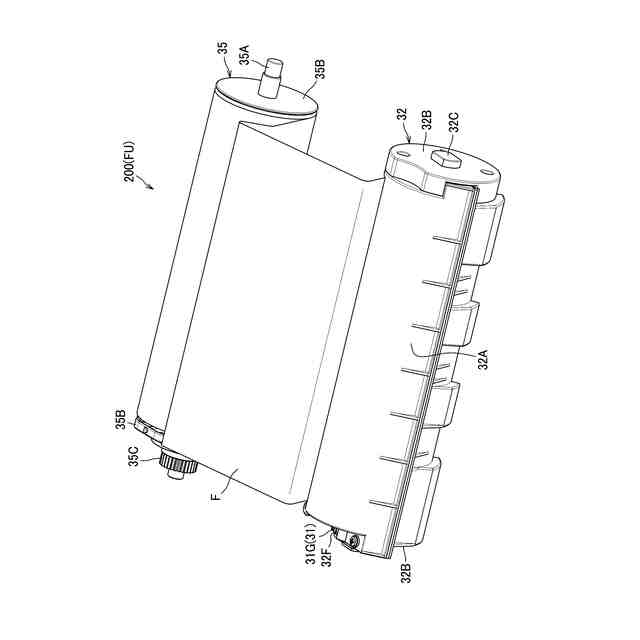 前記フィルムカートリッジは、前記供給リールを収容する供給ケースを備えていてもよい。また、前記供給リールは、前記供給ケースに回転可能に支持されていてもよい。また、前記供給リールは、前記供給リールの軸方向端部に供給ギヤを有し、前記供給ギヤは、前記供給ケースに形成された切欠から外部に露出しているものとすることができる。また、前記供給ケースは、前記軸方向の端部に設けられる2つの側壁と、前記2つの側壁のうち、前記供給ギヤに近い一方の側壁から前記軸方向に離れて位置し、かつ前記供給ギヤの少なくとも一部を前記軸方向から覆う外側壁と、前記一方の側壁と前記外側壁とを連結する外周壁と、を有し、