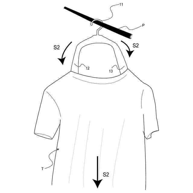 本発明の実施形態に係る衣料用ハンガー1をポールPに吊り下げ、ティーシャツTを取り外すステップS3を示す図である。