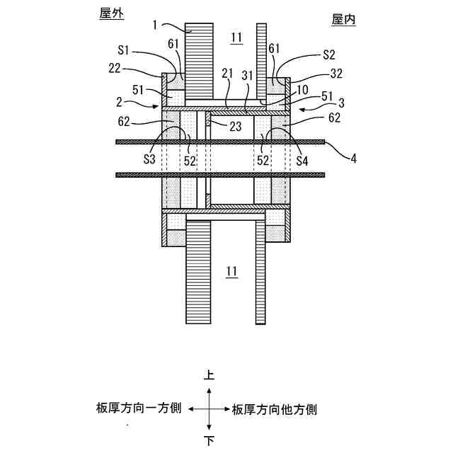 ところで、押出成形セメント板のような中空パネルを板厚方向に貫通する貫通穴を開設し、貫通穴に給水配管などの金属製の配管を挿通する場合がある。この場合、屋外側からの雨水や中空パネルの中空部からの雨水が貫通穴を介して屋内側に進入しないように止水する必要がある。