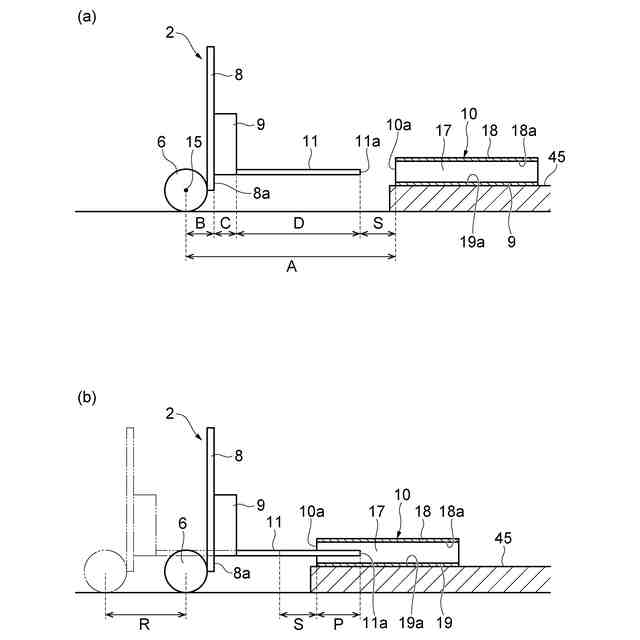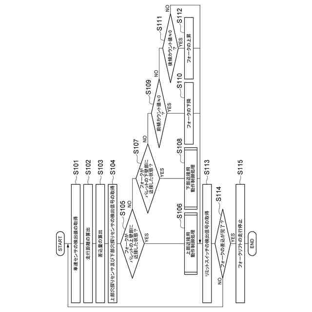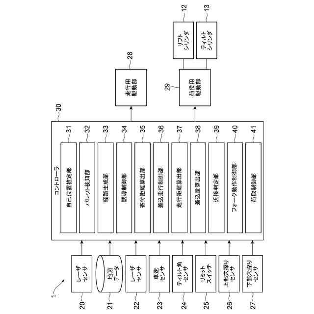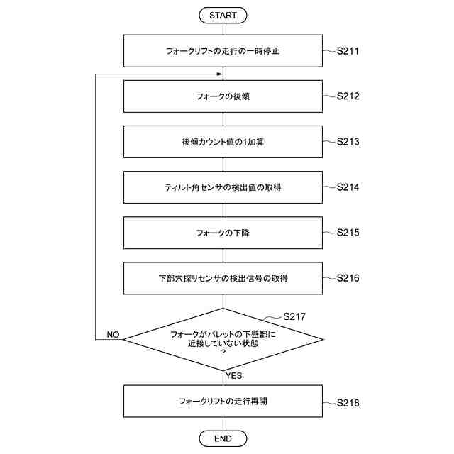 (3)上記の(2)において、差込走行制御部は、近接検知部によりフォークの先端が上壁部及び下壁部の何れかに近接したことが検知されたときに、フォークリフトの走行を一時停止させるように走行用駆動部を制御し、フォーク動作制御部は、近接検知部によりフォークの先端が上壁部に近接したことが検知されたときは、フォークリフトの走行が一時停止した状態で、フォークがマストと一緒に前傾するようにティルトシリンダを制御すると共に、マストの前傾によりマストが下降する距離よりも長い距離だけフォークが上昇するようにリフトシリンダを制御し、近接検知部によりフォークの先端が下壁部に近接したことが検知されたときは、フォークリフトの走行が一時停止した状態で、フォークがマストと一緒に後傾するようにティルトシリンダを制御すると共に、マストの後傾によりマストが上昇する距離よりも長い距離だけフォークが下降するようにリフトシリンダを制御し、差込走行制御部は、フォーク動作制御部の処理が実行された後、フォークリフトの走行を再開させるように走行用駆動部を制御してもよい。