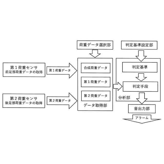 装着者の前足部が載る部位に設けた第1荷重センサと、後足部が載る部位に設けた第2荷重センサと、