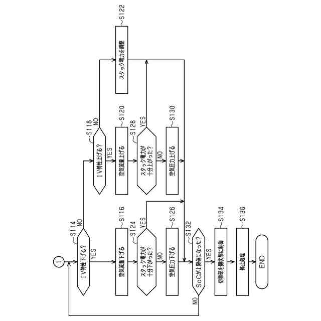 前記動作制御部は、前記特定部により特定された前記IV特性に基づいて、前記スタック電力が、前記目標スタック電力よりも低い場合、前記エアコンプレッサに圧送させる前記酸化剤ガスの圧力を、通常の制御状態に比して増加させること、又は前記特定部により特定された前記IV特性に基づいて、前記スタック電力が、前記目標スタック電力よりも高い場合、前記エアコンプレッサに圧送させる前記酸化剤ガスの圧力を、通常の制御状態に比して減少させることを行う、