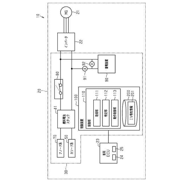 【解決手段】燃料電池システム30は、燃料電池スタック41と、切替部80と、蓄電装置90と、電流センサ91と、電圧センサ92と、制御装置100とを備える。切替部80は、蓄電装置90のSoCが上昇した場合、燃料電池スタックと、モータジェネレータ21とを電気的に接続せず、かつ蓄電装置90のSoCが減少して場合、燃料電池スタックとモータジェネレータ21とを電気的に接続する。特定部112は、燃料電池スタックのIV特性を特定する。動作制御部113は、スタック電力が低い場合、エアコンプレッサに圧送させる空気の量を増加させる。動作制御部113は、スタック電力が高い場合、エアコンプレッサに圧送させる空気の量を減少させる。