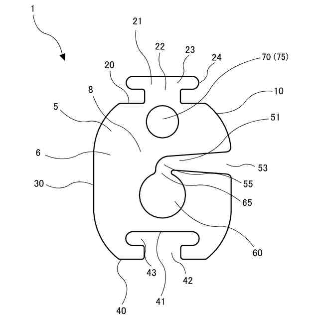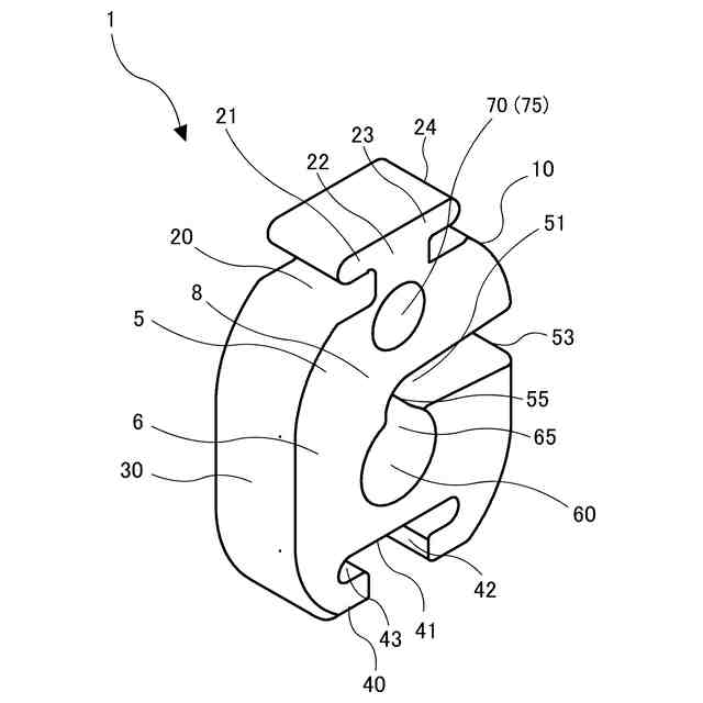 図1および図2は、本開示の第一の実施形態の医療用配管の保持器1を示す図である。ここで、医療用配管3とは、点滴等の中空の医療用チューブだけでなく、医療機器の配線(電線等)等の中実の配管を含む。本実施形態において、医療用配管の保持器1は、ブロック5を具備し、ブロック5は、例えば、射出成形法により形成された、表面6と、裏面7との間に一定の厚みを有する板状のブロックであって、中壁8の周囲に第1の側壁10、第2の側壁20、第3の側壁30および第4の側壁40とを備えるものである。ブロック5を表面6に対向する側から見たときに、第1の側壁10および第3の側壁30の各外周面は、互いに外方へ膨らむ凸型の曲面に形成されている。本実施形態において、第1の側壁10、第2の側壁20、第3の側壁30および第4の側壁40と、表面6または裏面7とをつなぐ部分は、面取りされた曲面となっている。ブロック5の大きさは、5~200mm×5~250mm、10~150mm×10~200mmまたは10~100mm×10~120mmとすることができる。ブロック5の材料としては、例えば、高密度ポリエチレン(HDPE)、低密度ポリエチレン(LDPE)、ポリプロピレン(PP)、ポリ塩化ビニル(PVC)、ポリスチレン(PS)等の樹脂を挙げることができ、特に低密度ポリエチレン(LDPE)を好適に用いることができる。ブロック5は、これらの材料樹脂を少なくとも50質量%以上含むことが好ましく、70質量%以上含むことがより好ましく、90質量%以上含むことがさらに好ましい。ブロック5には、着色剤、その他添加剤などを添加することができる。着色剤としては、特に限定されないが、顔料、染料等を用いて、所望の色にすることができる。ブロック5は、通常の成形方法、例えば射出成形法、型抜き法によって製造することができる。