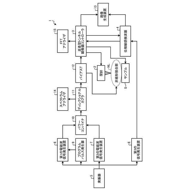 また、特許文献1には、互いに異なる周波数を有する2つの高周波信号を導入することにより、測定対象と走査型トンネル顕微鏡の探針との間に流れるトンネル電流に重畳されるヘテロダインビート信号を検出して、測定対象の電子状態等の状態を原子レベルの空間分解能で測定する技術が開示されている。特許文献1の技術では、測定対象と高周波信号との相互作用により発生する吸収、放射、励起等の周波数が未知である場合、いずれか一方の高周波信号の周波数を掃引して吸収等が起こる周波数を検出している。