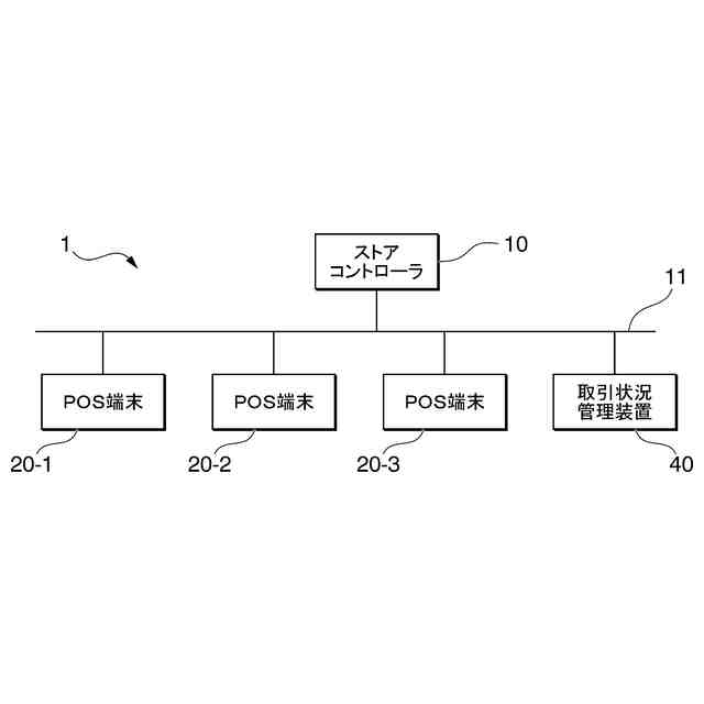 以下、本発明の第1実施形態について図面を参照して説明する。図1は、本発明の実施形態に係るPOS(Point Of Sales)システム1のネットワーク構成図である。図1に示すPOSシステム1は、3台のPOS端末20-1、POS端末20-2、POS端末20-3と、ストアコントローラ(ストアコンピュータ)10と、取引状況管理装置40とを備え、夫々はLAN11を介して通信可能に接続されている。POSシステム1は、種々の店舗等(スーパーマーケット、コンビニエンスストア、ドラックストア、ホームセンタ、家電量販店等)に導入可能である。以下、POS端末20-1、20-2、20-3について特に区別しない場合には、POS端末20と総称する。