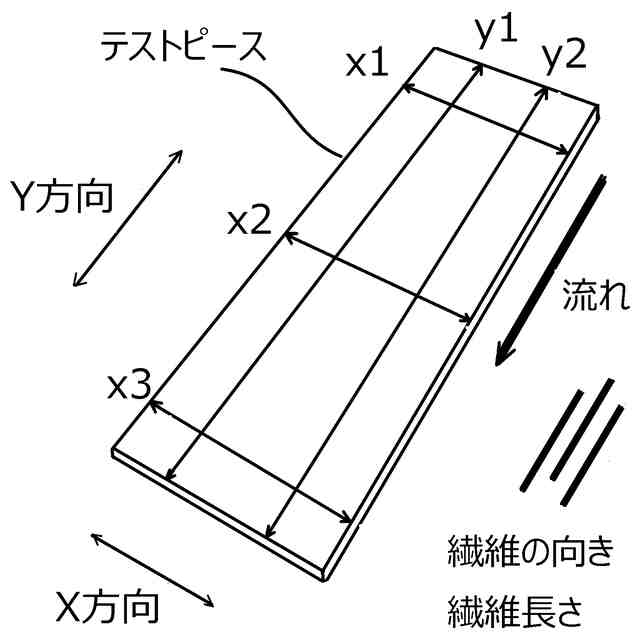 図2の右上から加熱溶融状態で材料を入れ、冷却にて成形した場合、材料の流れ方向(図内の赤い矢印)にそって、炭素繊維が配列する(図内の青い線)傾向があり、樹脂の流れ方向(Y)と、樹脂の流れ垂直方向(X)で、成形体の成形収縮率が異なる問題を生じる。