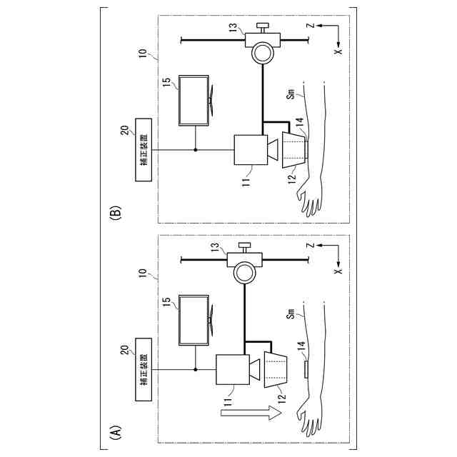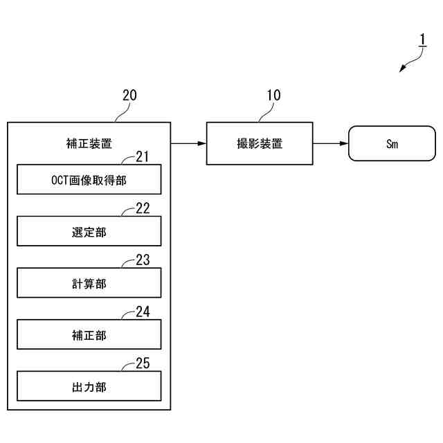 [1]本発明の一態様は、生体内の生体組織を試料として光干渉断層(OCT:Optical Coherence Tomography)撮影することにより得られたOCT画像を取得するOCT画像取得部と、異なる時刻に撮影された複数の前記OCT画像のうち、いずれかの前記OCT画像を参照画像として選定する選定部と、前記参照画像が撮影された時刻とは異なる時刻に撮影された前記OCT画像内に表される前記試料の位置と、前記参照画像内に表される前記試料の位置とのズレ量を計算する計算部と、前記計算部により計算された前記ズレ量に基づいて、前記OCT画像内における前記試料の位置を補正する補正部と、前記補正部により補正された前記OCT画像を出力する出力部と、を備える補正装置である。