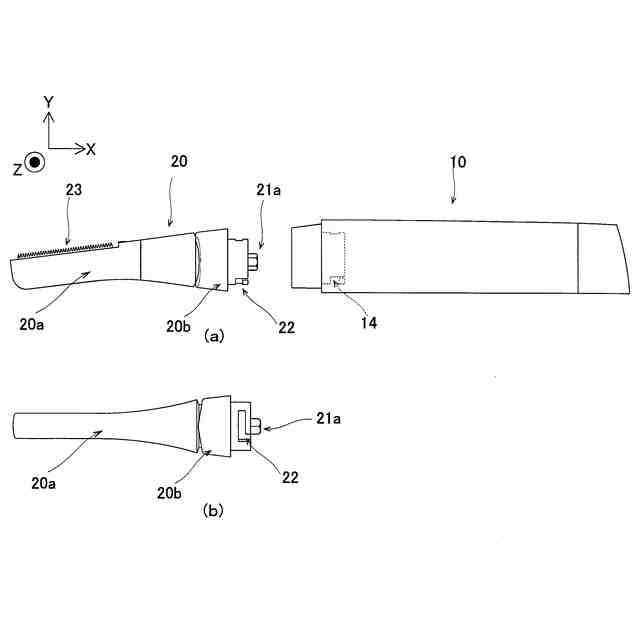 【解決手段】電動器具100は、モータ11を含む本体部10と、モータ11により駆動される駆動刃23を含み、本体部10に対し揺動可能であるとともに、本体部10と係合するヘッド部20と、モータ11の動力を駆動刃に伝達する複数の部分に分割可能な動力伝達機構と、を備える。そして、ヘッド部20は、動力伝達機構が複数の部分に分割されることにより、本体部10と分割可能に構成されている。