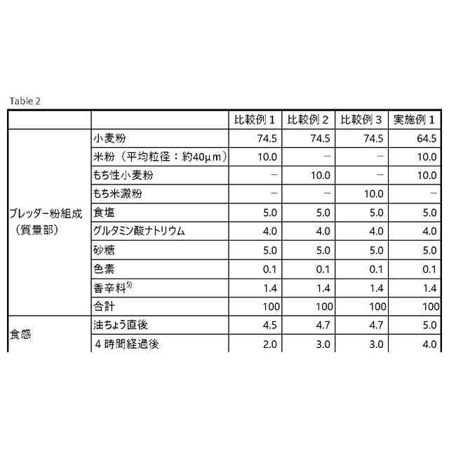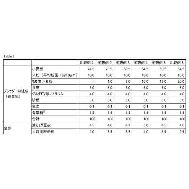 本発明者らは上記課題に鑑み検討を重ね、もち性小麦粉及び米粉を含有し、これらの含有量が特定の範囲にあるブレッダー粉は、油ちょう直後の曳きのないソフトで口溶けの良い食感を長い時間維持する揚げ物の衣を調製できることを見出した。本発明はこれらの知見に基づき完成されるに至ったものである。