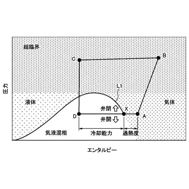 このような冷媒循環システムでは、液状態の冷媒がコンプレッサに流入すること(液バック/液戻り)によるコンプレッサの故障などを防止するために、蒸発器で加熱された冷媒を余裕を持たせて加熱して、完全にガス化した冷媒をコンプレッサに供給するように制御が行われている。冷凍サイクルにおいて、この余裕を持たせた加熱の度合いは「過熱度」と呼ばれており、過熱度は、コンプレッサ前の圧力(つまり蒸発器の圧力)に応じた飽和蒸気温度及びコンプレッサ前の冷媒温度から求められる。このような冷凍サイクルの過熱度を制御する技術が、例えば特許文献1に開示されている。