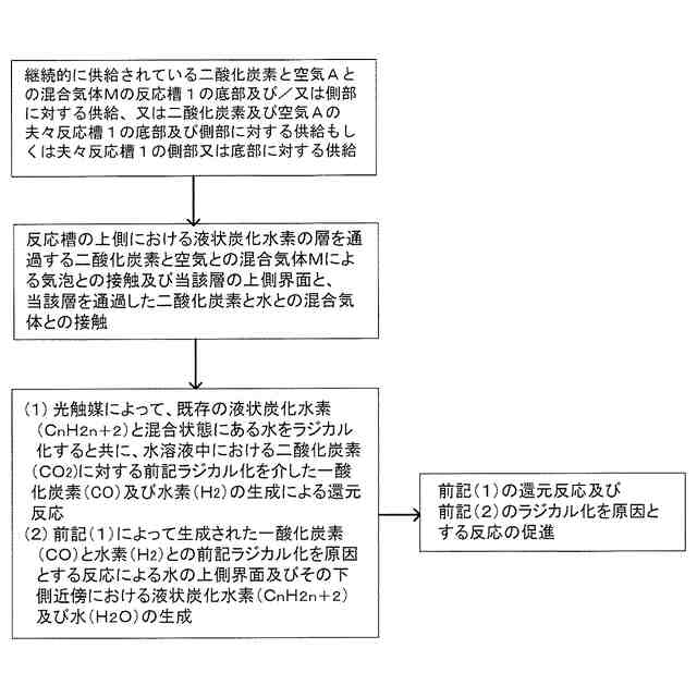 【解決手段】液状炭化水素HCと混合状態にある水Wを収容している反応槽1内にて光触媒を介して、二酸化炭素及び水Wを一酸化炭素及び水素に還元し、光触媒を介した一酸化炭素と水素との化学反応によって液状炭化水素HCを合成する方法であって、二酸化炭素と空気Aとの混合気体Mを反応槽1の底部及び/又は側部から供給するか、又は二酸化炭素及び空気Aを夫々反応槽1の底部及び側部から供給するか、若しくは夫々反応槽1の側部及び底部から供給することによって、水Wの上側に合成されている液状炭化水素HCの層を通過する混合気体Mの気泡との接触、前記層の上側界面との混合気体Mとの接触による
