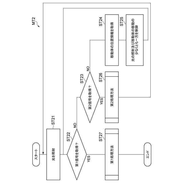 前記第1信号、前記第2信号及び前記位置情報の少なくとも1つに基づいて、前記移動体に対する光の照射位置を検出する検出部と、