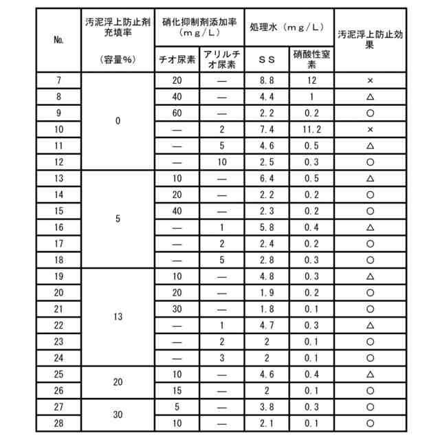 汚泥の浮上を抑制する方法としては、生物処理槽に硝化抑制剤を添加し、脱窒素の原因となる硝化を抑制する方法がある。例えば、特開平5-337489号公報(特許文献1)は、沈殿槽を有する活性汚泥処理装置にチオ尿素又はアリルチオ尿素等の薬剤を添加することにより窒素化合物の硝化反応を抑制し、沈殿槽での硝化脱窒素による活性汚泥の浮上を防止する方法が記載されている。その他にも、汚泥の浮上を抑制する方法には、硝化で生成した硝酸性窒素、亜硝酸性窒素をメタノールなどの水素供与体を添加して脱窒素する方法や、曝気風量やSRTの調整等の運転管理によって硝化を抑制する方法等がある。例えば、特開2000-334492号公報(特許文献2)には、炭素数が6以上の直鎖状飽和モノカルボン酸を担持体に担持させた脱窒素促進剤を使用することが記載されている。