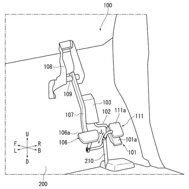 本発明によれば、車両の乗員が急ブレーキをかけようとしてブレーキペダルでなくアクセルペダルを誤って選択してしまった場合、すなわち所定値以上のストローク速度でアクセルペダルが踏まれようとした場合に、先に補助ペダルを踏むこととなる。その結果、補助ペダルはアブソーバに減衰力を発生させてブレーキペダルを連動させ、乗員は実質的にブレーキペダルを踏んで車両を制動する。すなわち補助ペダルを介してアクセルペダルが踏まれる前に車両の制動を開始するので、ブレーキペダルおよびアクセルペダルの踏み間違いにより引き起こされる車両の急加速を防止し、安全に車両を制動できる。