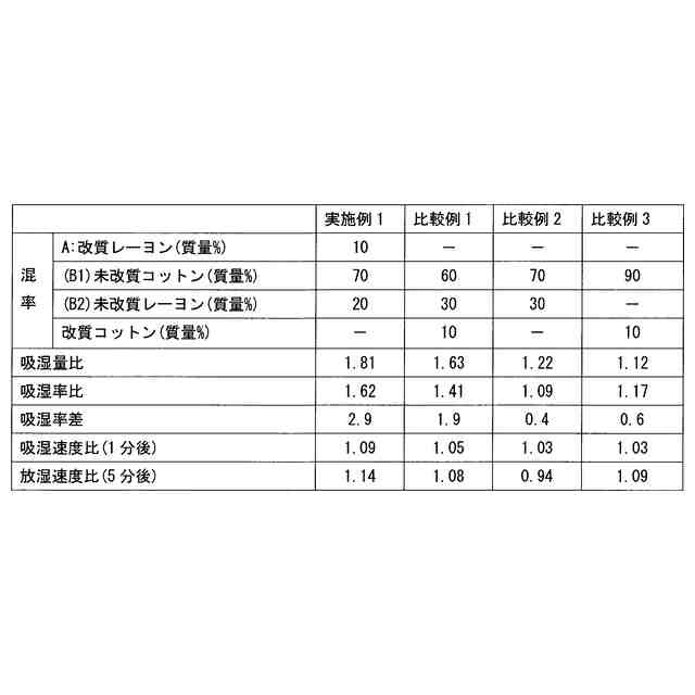 未改質セルロース繊維(B)は、エチレン性不飽和二重結合を含む化合物がグラフト結合されていない未改質コットン繊維(B1)(本明細書中、「未改質コットン繊維」ともいう。)、又は未改質コットン繊維(B1)と未改質再生セルロース繊維(B2)の混紡であることが好ましい。混紡割合は、混紡紡績糸100質量%に対して、改質再生セルロース繊維(A)5~20質量%、未改質コットン繊維(B1)80~95質量%、若しくは、改質再生セルロース繊維(A)5~20質量%,未改質コットン繊維(B1)は50~85質量%、未改質再生セルロース繊維(B2)は10~30質量%が好ましい。前記の範囲であればより好適な清涼性を発現できる。