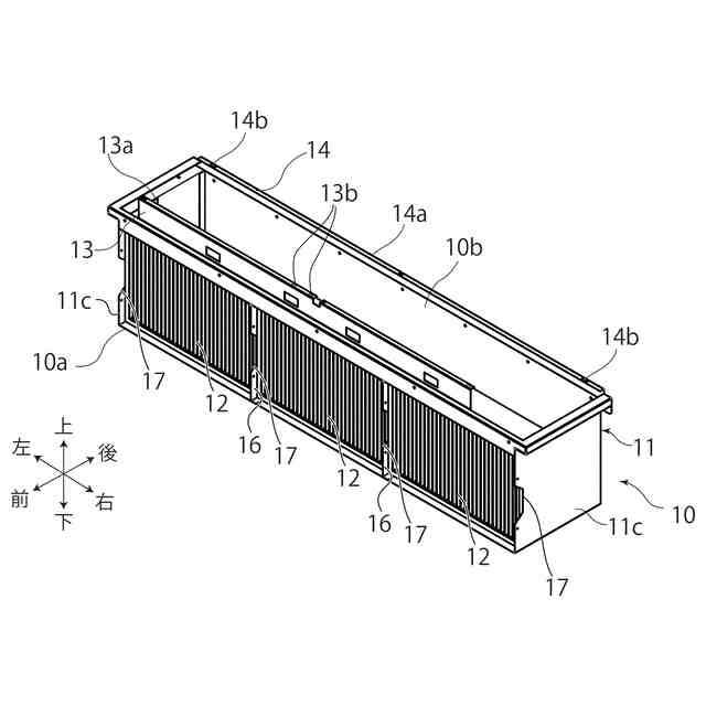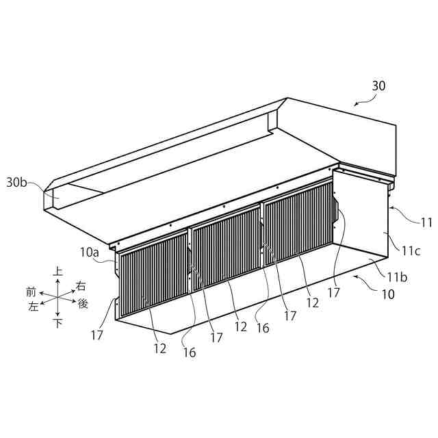 本実施形態におけるフィルタユニット10は、空気調和機30に取り付けられる。空気調和機30は、空調機側吸込口30aと、空調機側吹出口30bと、を有する。空調機側吸込口30aは、空気調和機30内に空気を下方から上方に吸い込む。空調機側吹出口30bは、空調機側吸込口30aから吸い込まれ、上下方向に略直交する水平方向に導かれて調和された空気を、空気調和機30の正面(前方)から吹き出す。