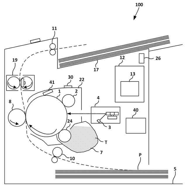 図1は電子写真方式の画像形成装置100を示している。画像形成装置100は、着脱可能なプロセスカートリッジ22を装着している。プロセスカートリッジ22は、感光ドラム1、帯電ローラ2、現像ローラ24、トナー容器7、清掃部材41、および不揮発性メモリ30を有している。