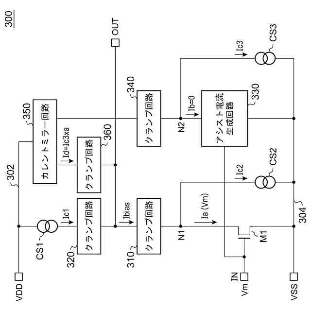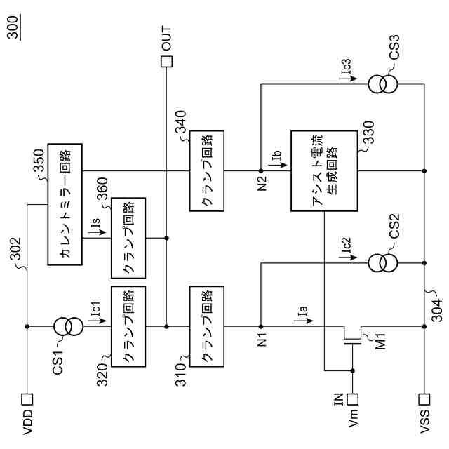 【解決手段】第1電流源CS1は、電源ライン302と接続される。第1トランジスタM1は、ゲートが入力端子INと接続され、ソースが接地ライン304と接続される。第2電流源CS2は、第1トランジスタM1のドレインである第1ノードN1と接地ラインの間に接続される。アシスト電流生成回路330は、中間信号Vmが低いほど大きくなるアシスト電流Ibを生成する。カレントミラー回路350は、アシスト電流Ibを折り返し、出力端子OUTに供給する。