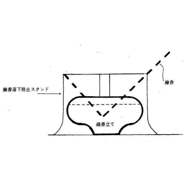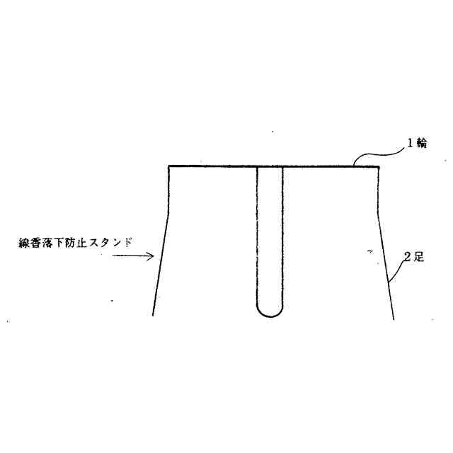 線香立て外周にスタンドを置くだけで線香立てより上に設けた輪、枠が線香の倒れ、落下を防止でき線香の落下火災を防ぐ。正面からの違和感を除くため細い線材、三本足構造とした。線香の火は[図3]に示すように金属製の輪、枠と接触すると線香の火は消える。輪、枠からの下の線香は消えた線香になり安全。